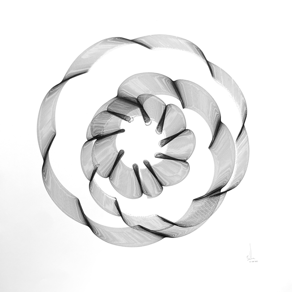 Seine Werke entstehen nicht durch digitale Plotter, sondern durch selbst gebaute Maschinen, die einfache, rhythmische Bewegungen ausführen. Diese Bewegungen überlagern sich, verschieben sich minimal, treten in Resonanz – und bilden auf der Fläche eine visuelle Sprache, die sich zwischen System und Schwingung entfaltet.