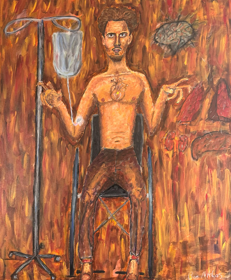 Ein zentrales Element seiner aktuellen Arbeiten ist das Selbstporträt. Darin zeigt er sein eigenes Verständnis von sich selbst in besonderen Situationen und emotionalen Zuständen – offen, ehrlich und verletzlich. In vielen Werken taucht zudem eine feminine Präsenz auf, die sich durch konkrete Figuren, fließende organische Formen oder symbolische Elemente ausdrückt.