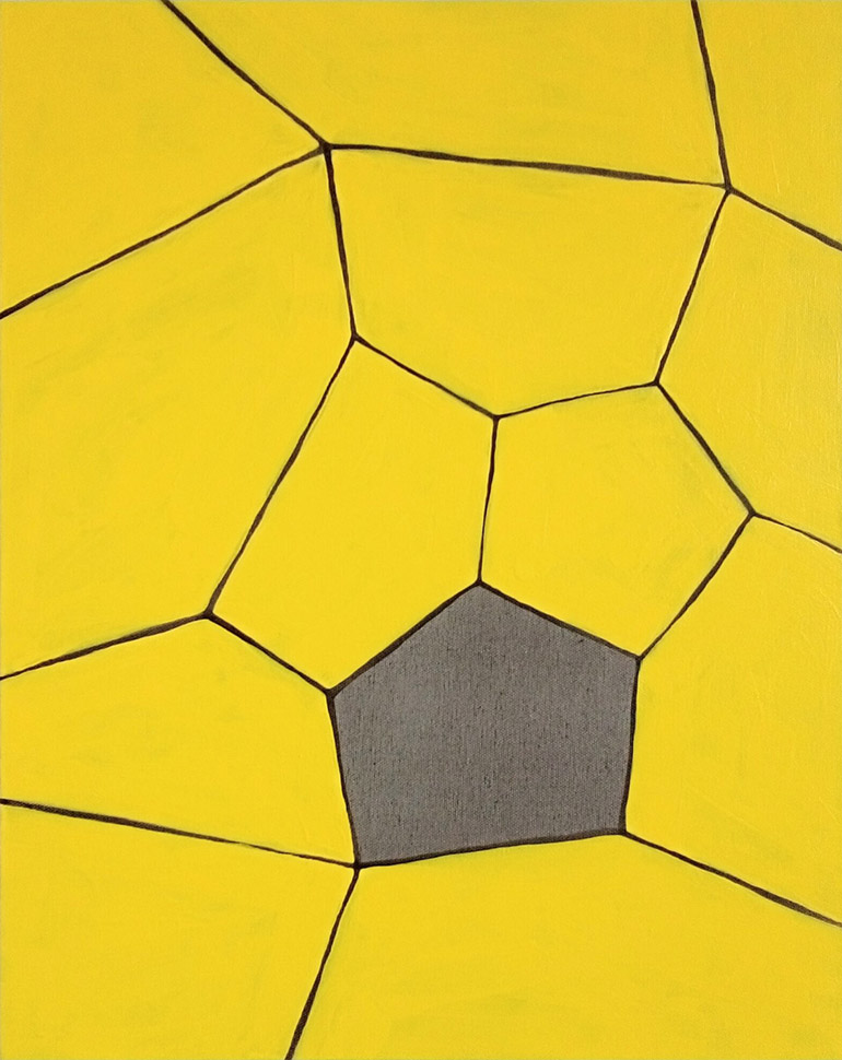 Zurzeit ist ihre Malerei fünfeckig. Manchmal sieht es in ihren Bildern wie ein fünfeckiges Loch aus. Und durch das Loch im Bild sieht man einen Teil von diesem unendlichen Raum. Die fünfeckige Figur ist für Isar etwas Allgemeines. Es könnte ein Mensch, eine Blume, ein Stern oder etwas anderes sein.