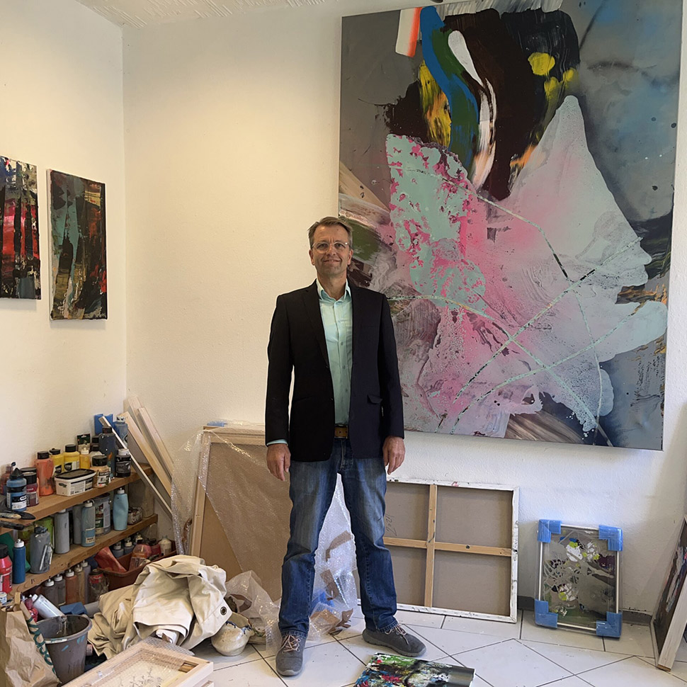 „Die abstrakte, informelle Malweise, man mag es nicht glauben, hat bei mir ihren Ursprung in der Landschaftsmalerei. Dabei interessiert es mich „Räume“ zu schaffen, die den Betrachter im Idealfall zum Verweilen einladen. Bei meinen Spaziergängen durch die Landschaft werde ich meist durch meine Neugier vom Horizont gelockt, wissen zu wollen, was mich „dahinter“ erwartet. In diesem Sinne entstehen bei meiner Malweise durch “ Übermalungen “ oft auch Horizonte, die in die Tiefe des Raums einladen.“