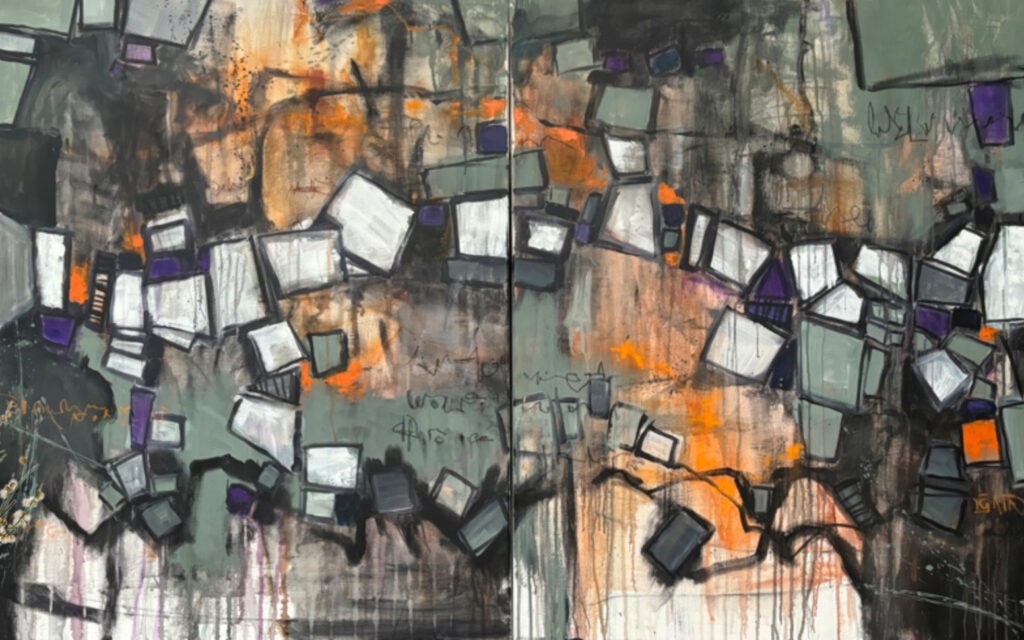 Seine abstrakten Arbeiten zeigen intensive und gebrochene Farbelemente, die mit linearen Strukturen um Dominanz ringen.