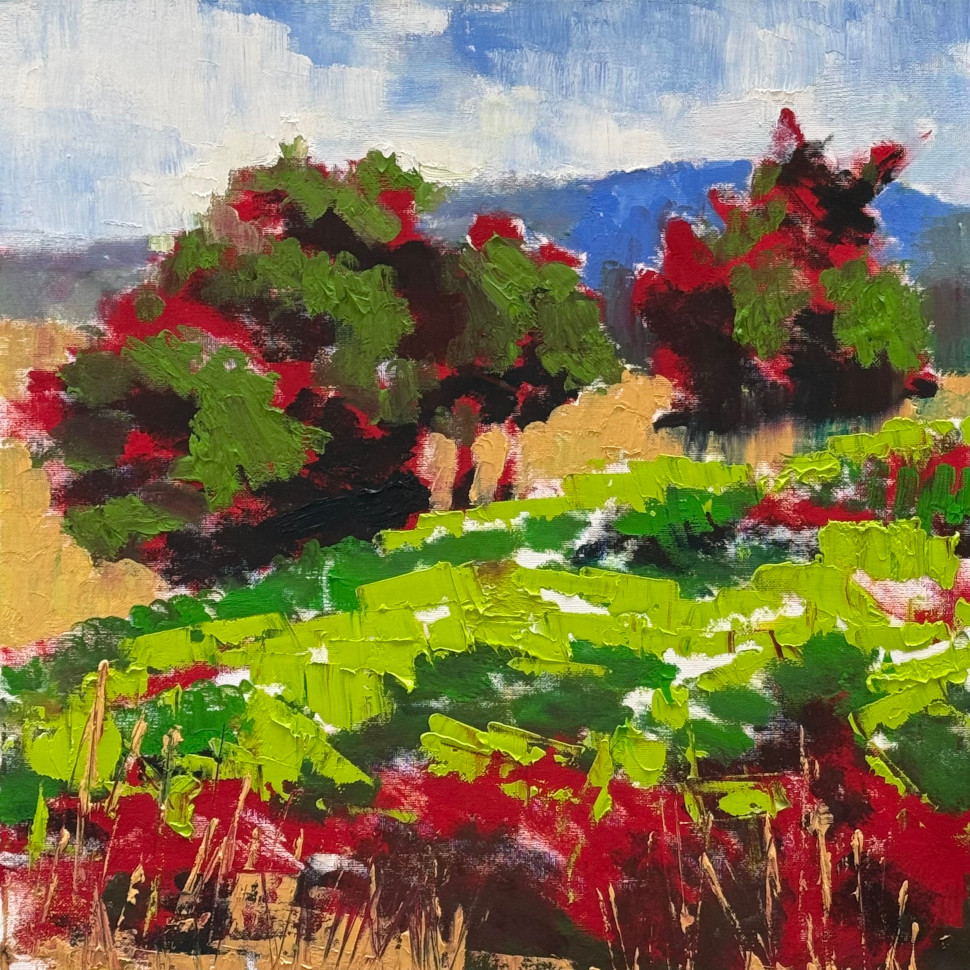 Im Rahmen der Ausstellung präsentiert sie drei Werkserien aus dem Jahr 2025: „Heimat – Landschaften“, „Früchte – Farbvielfalt“.