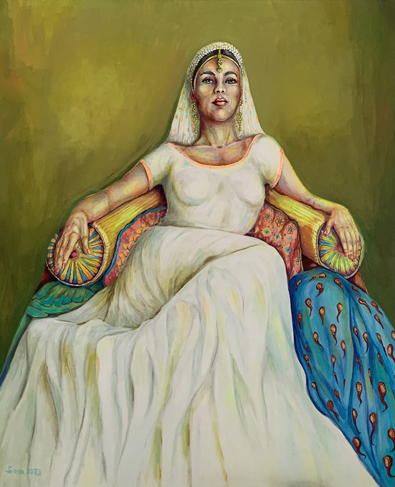 Die Künstlerin Sara beschäftigt sich in ihrer Malerei und mit ihren Ölbildern mit der „natürlichen Weiblichkeit“ – keine kulturell geprägte Weiblichkeit. Sie ist an weiblichen Prinzipien interessiert und verwendet dazu in ihrem figurativen künstlerischen Ausdruck das Porträt als Mittel der Wahl. Hierbei handelt es sich nicht um tatsächlich lebende Menschen , sondern um „Prototypen“ von Frauen, die einen bestimmten weiblichen Aspekt als Ausstrahlung zum Vorschein bringen. Dazu bedient sie sich in ihren Gemälden um florale oder sehr naturnahe Umgebungen mit teilweise bestimmten Tieren, um die Natürlichkeit der Frauen stärker zu betonen. Für die Künstlerin spielt die ganzheitliche Betrachtung ihres Themas eine große Rolle. So beschäftigt sie sich auch mit den Beziehungen in der Weiblichkeit zur Männlichkeit, zur Welt, zu den Religionen, etc.