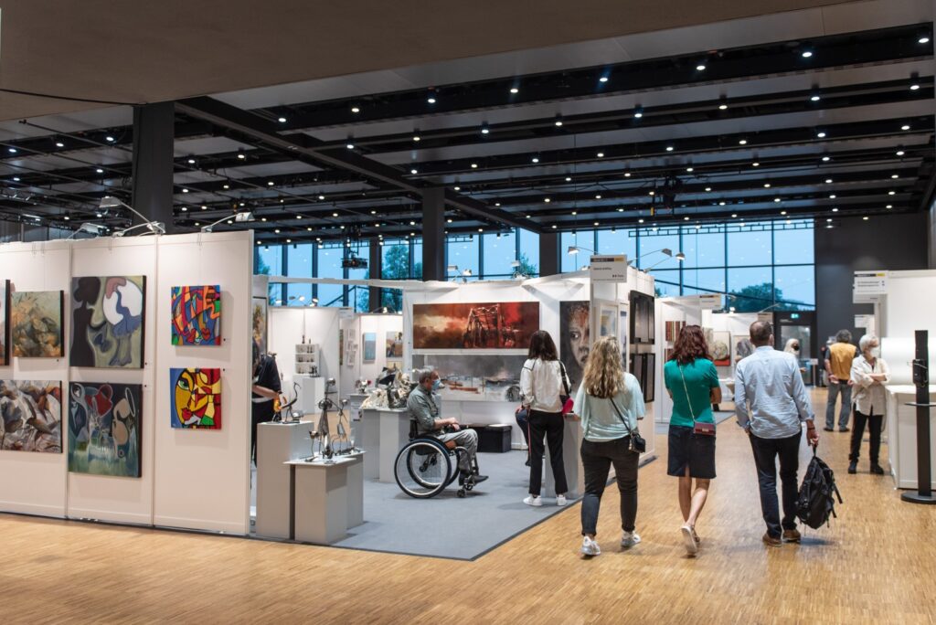 Rund 60 Galerien und Künstler:innen, aus Deutschland und dem angrenzenden Ausland präsentieren ihre Kunst im Erd- und Obergeschoss des klimatisierten Bodenseeforums.