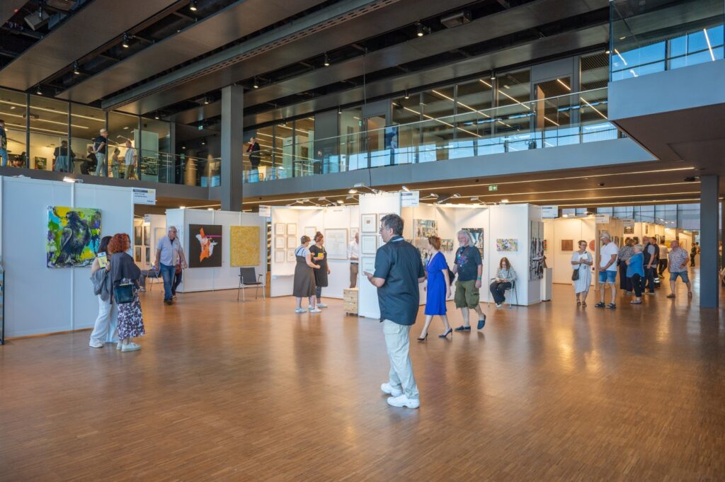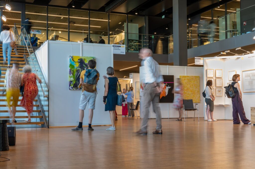 Rund 60 Galerien und Künstler:innen, aus Deutschland und dem angrenzenden Ausland präsentieren ihre Kunst im Erd- und Obergeschoss des klimatisierten Bodenseeforums.